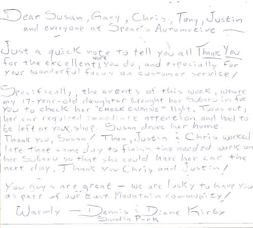You don't have to take our word for it! Here's what some of our satisfied customers have to say about Spear's Automotive Center: